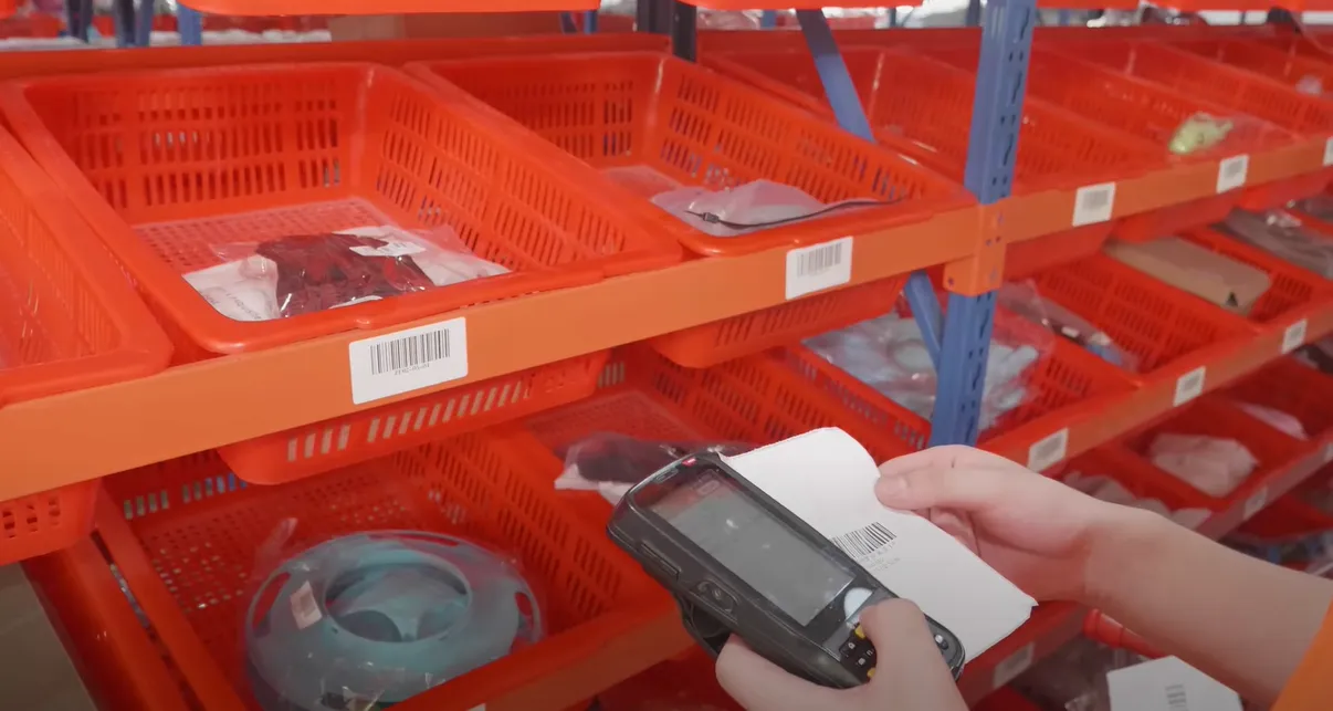 In this case, we will go to our storage section to pick the products out. Since every product is well organized by category and stored on shelves, we just need to scan the bar codes of the specific order to know the exact locations of them, which is very effective and time-saving.